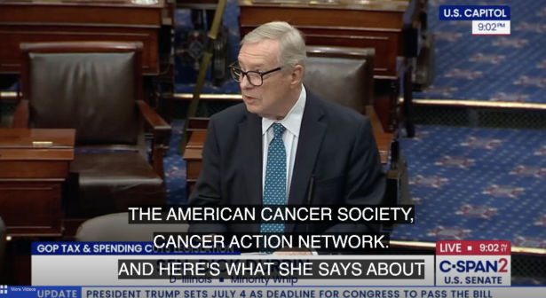 ACS CAN is deeply grateful to the dedicated team members and volunteers who continued to mobilize at every stage of our nationwide campaign. Our voices were heard – loud and clear. One of the most powerful moments in this fight came when Senator Dick Durbin brought ACS CAN’s position to the Senate floor. In his remarks (pictured below), he underscored the real-life consequences of the bill, quoting our statement directly:
